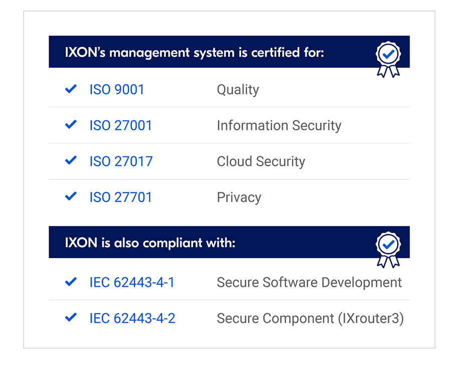 Az IXON rendszere az ISO 27001-es szabványnak megfelelően tanusított, ami a szervezetek információbiztonságának globális mércéje.