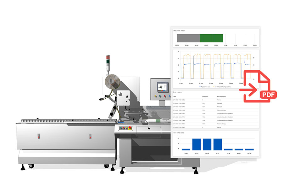 Generáljon PDF-jelentéseket automatikusan a gépi adatokból, és küldje el őket ügyfeleinek előre beállított időközönként, hogy tájékoztassa őket gépeik teljesítményéről.